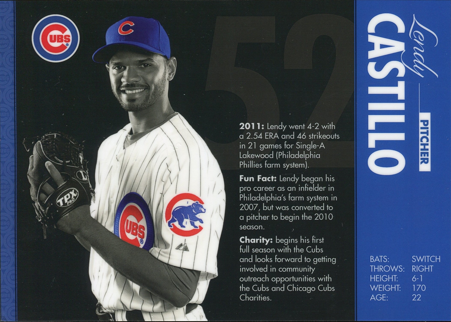 The giveaway cards were the same size as the previous edition, 5" x 7" and were printed on a heavy and glossy stock. The set has 28 cards and includes five players that weren't on the opening day roster (Bowden, Campana, Lopez, Maine, and Wells) and omits two that were with the team on opening day (Luis Valbuena and Shawn Camp).